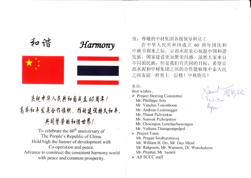 10月1日,適逢中華人民共和國成立60周年和中秋佳節(jié)即將到來之時,京都水泥廠的Choompon Lertchuchuwongsa先生和Prapan Sindhurattavej先生代表京都水泥廠的領導團隊和全體員工前往中材節(jié)能京都項目部,共同慶祝中華人民共和國成立60周年,向項目部全體人員致以節(jié)日的祝賀,送上了月餅、水果等節(jié)日禮品,并轉達了京都水泥對中材集團和中材節(jié)能全體領導和員工的誠摯祝福。